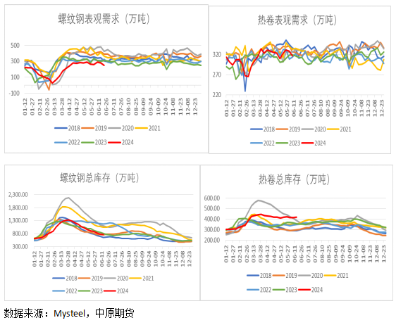 從鋼材供需基本面來看,當(dāng)前隨著淡季需求下滑壓力逐步顯現(xiàn),鋼材去庫進(jìn)一步收窄。其中,螺紋鋼周度產(chǎn)增需減,產(chǎn)量較上周增加3.73萬噸,表需大幅下降28.27萬噸,目前供需仍呈現(xiàn)雙弱的格局,庫存降幅繼續(xù)趨緩,較上周下降10.43萬噸至773.67萬噸,其中廠庫下降0.47萬噸至202.38萬噸,較2023年同期下降10%,社庫下降9.96萬噸至571.29萬噸,較2023年下降2%。熱卷方面,本周產(chǎn)需雙雙回落,產(chǎn)量下降2.7萬噸,表需下降11.25萬噸,供需絕對(duì)值仍處于歷史同期中位水平。但庫存由降轉(zhuǎn)增,總庫存較上周增加6.07萬噸,社庫增加3.37萬噸,高出2023年同期23%,廠庫偏低,環(huán)比增加2.7萬噸至87.8萬噸,較2023年同期略增0.7%。基于需求回落,當(dāng)前熱卷社庫壓力偏高,關(guān)注后續(xù)制造業(yè)補(bǔ)庫情況。螺紋鋼庫存壓力并未顯現(xiàn),但需留意6月之后供需結(jié)構(gòu)的變化,累庫拐點(diǎn)或?qū)⒃?月中旬到來。