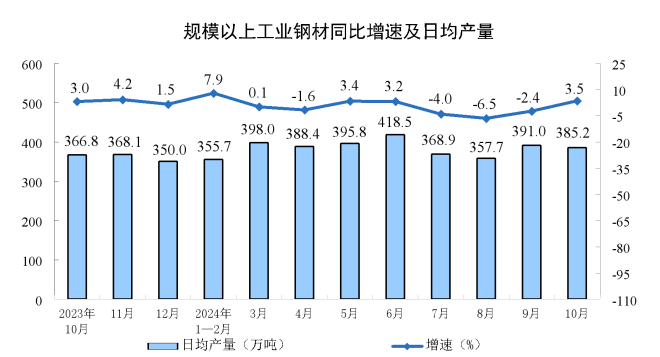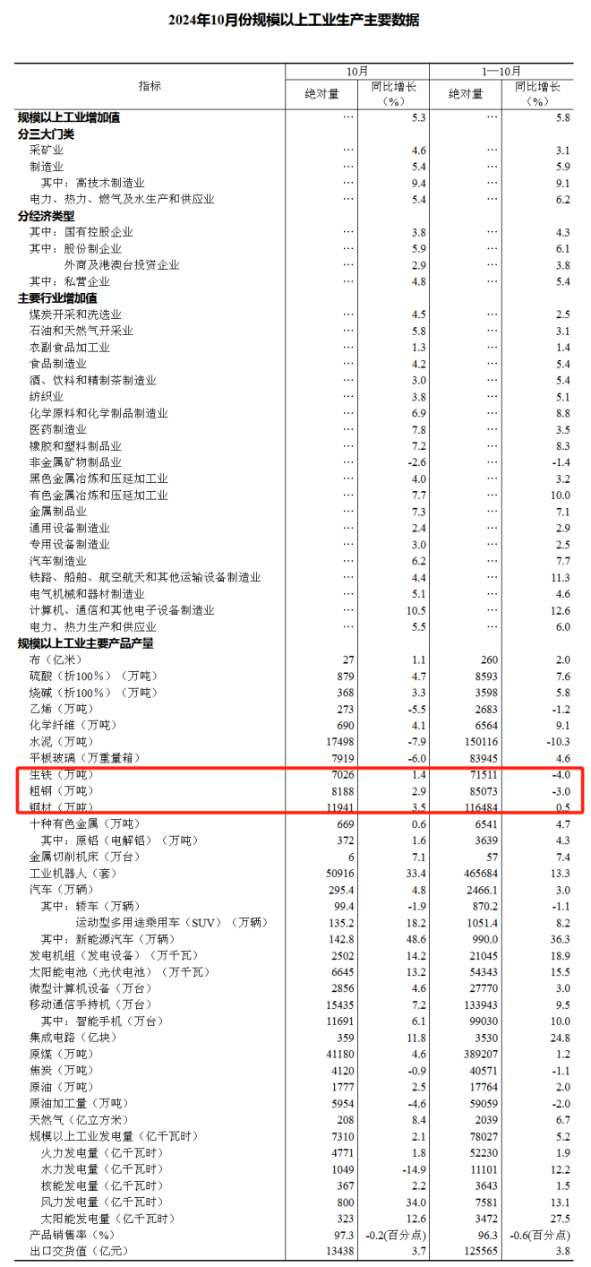 2024年10月份,我國鋼材產(chǎn)量11941萬噸,同比增長3.5%;1-10月份,我國鋼材產(chǎn)量116484萬噸,同比增長0.5%。