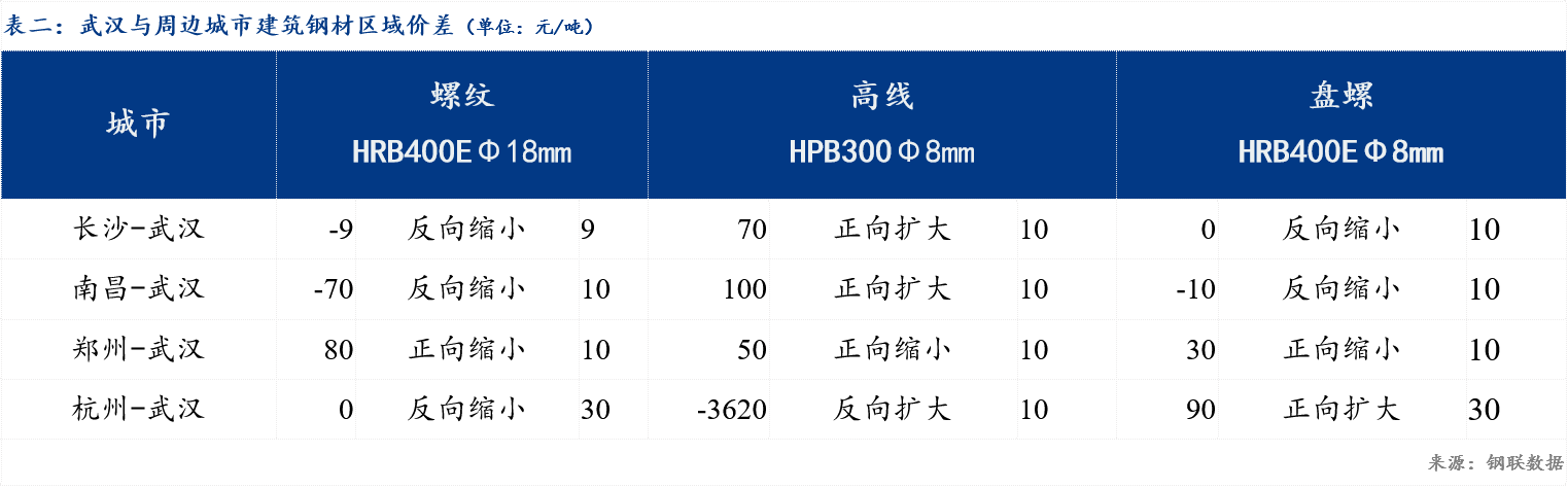 從品種價差對比看,武漢市場目前螺盤價差210元/噸左右,價差維持不變。從區域價差對比看,日內武漢市場螺紋鋼網價較長沙市場價格高9元/噸,較南昌市場高70元/噸,較鄭州市場低80元/噸,較杭州市場價格持平。