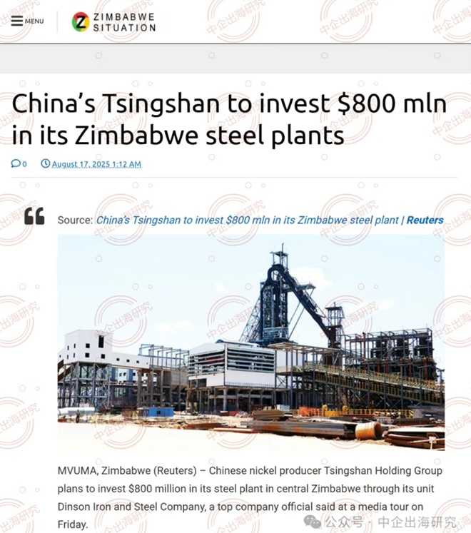 2025年8月15日,路透社(Reuters)發(fā)布報道文章《青山控股擬投資8億美元擴(kuò)建津巴布韋鋼鐵廠》(China's Tsingshan to invest $800 mln in its Zimbabwe steel plant)。