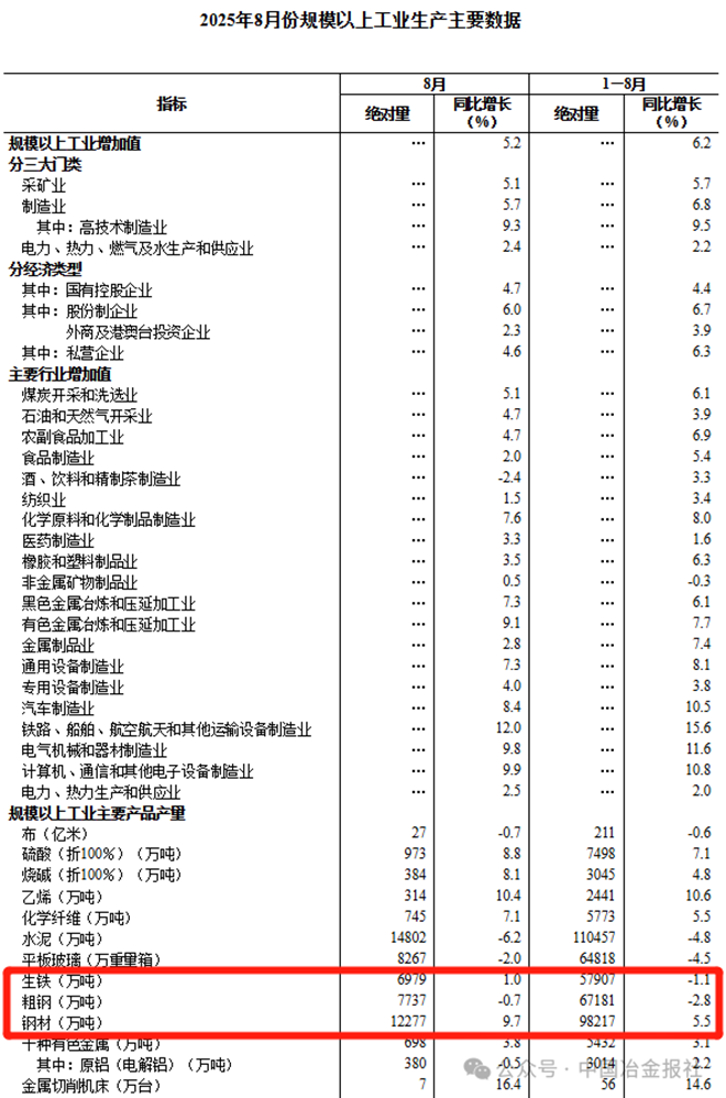 國家統計局公布的數據顯示:2025年8月份,中國粗鋼產量7737萬噸,同比下降0.7%;生鐵產量6979萬噸,同比增長1.0%;鋼材產量12277萬噸,同比增長9.7%。