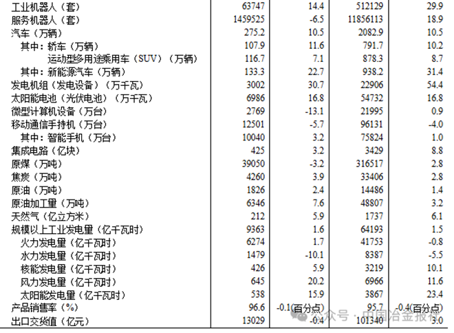 分產品看,8月份,規模以上工業623種產品中有319種產品產量同比增長。其中,鋼材12277萬噸,同比增長9.7%;水泥14802萬噸,下降6.2%;十種有色金屬698萬噸,增長3.8%;乙烯314萬噸,增長10.4%;汽車275.2萬輛,增長10.5%,其中新能源汽車133.3萬輛,增長22.7%;發電量9363億千瓦時,增長1.6%;原油加工量6346萬噸,增長7.6%。