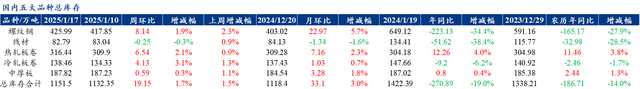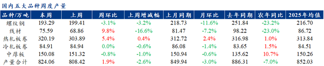 供應(yīng)方面,本周五大鋼材品種供應(yīng)824.06萬(wàn)噸,周環(huán)比增加15.64萬(wàn)噸,增幅1.9%。本周五大鋼材品種產(chǎn)量中除螺紋、中厚板材外其余品種產(chǎn)量均有所下降,核心驅(qū)動(dòng)在于,鋼廠前期產(chǎn)線檢修恢復(fù),部分鋼廠復(fù)產(chǎn)。庫(kù)存方面,本周五大鋼材總庫(kù)存1151.5萬(wàn)噸,周環(huán)比增19.15萬(wàn)噸,增幅1.5%。本周五大品種總庫(kù)存除線材外均有所增加:廠庫(kù)周環(huán)比增加,增幅主要來(lái)自冷軋貢獻(xiàn)。社庫(kù)周環(huán)比增加,增幅主要來(lái)自螺紋貢獻(xiàn)。消費(fèi)方面,本周五大品種周消費(fèi)量為804.91萬(wàn)噸,環(huán)比增加1.7%;其中建材消費(fèi)環(huán)比增1.1%,板材消費(fèi)環(huán)比增1.9%。本周五大品種表觀消費(fèi)呈現(xiàn)建材板材雙增的局面。