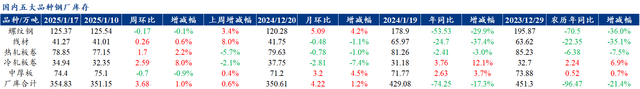 3、水泥&混凝土:1月8日-1月14日,本周全國(guó)水泥出庫(kù)量268.78萬(wàn)噸,環(huán)比下降9.76%,年同比下降43.25%;基建水泥直供量170萬(wàn)噸,環(huán)比下降6.08%,年同比下降5.03%;1月8日-1月14日,百年建筑調(diào)研國(guó)內(nèi)506家混凝土攪拌站產(chǎn)能利用率為6.37%,周環(huán)比下降0.26個(gè)百分點(diǎn);年同比下降2.97個(gè)百分點(diǎn)。506家混凝土攪拌站發(fā)運(yùn)量為127.64萬(wàn)方,周環(huán)比減少3.88%,年同比減少31.81%。